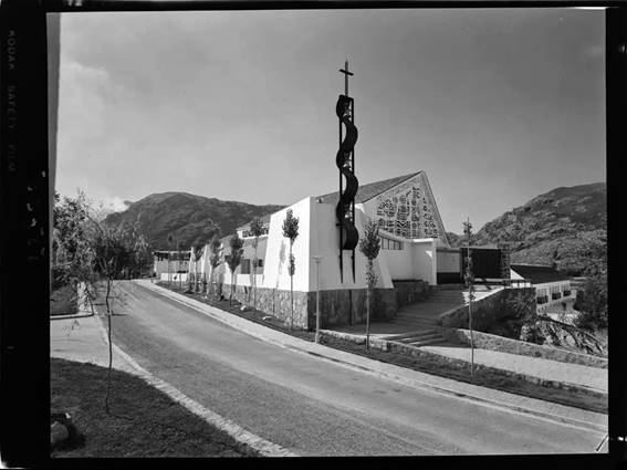 La Plaza Mayor, que adoptó una solución parcialmente porticada integrado el centro cívico también proyectado por Antonio Teresa Martín, aglutina la referencia icónica del conjunto. [8] El modelo urbano del poblado —nada ajustado al paradigma franquista tradicional que sí lograba su precedente— diversificó los focos evitando la concentración de los edificios públicos en el ágora y los dispersó a lo largo del eje de la localidad. El propio edificio del parador de turismo, diseñado en junio de 1962 por Alfonso Villamarín, cedió asimismo cualquier pretensión de significación. Efectivamente, la iglesia condensaba una extraordinaria relevancia simbólica tanto desde el punto de vista arquitectónico como en lo relativo a la renovación del lenguaje. Más aún, adoptaba la vocación de constituirse en el lugar de reunión de la comunidad para, con doble propósito, compartir la fe y hacer memoria de los fallecidos por la tragedia. [9]