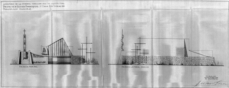 Fig. 12. Antonio Teresa Martín, San Andrés, Ribadelago (Zamora), 1960; fachadas principal y lateral derecha.