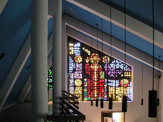 La luz adquirió singular importancia en esta iglesia, pues el arquitecto le atribuyó la responsabilidad de significar con carácter protagonista sus ámbitos litúrgicos. Esta finalidad se mantuvo a pesar de las variaciones que la solución definitiva introdujo sobre lo proyectado. Destacaba la gran cristalera prevista en la fachada principal formada por doce bandas verticales, por medio de la cual el arquitecto pretendió llenar de luz el templo. Contrastaba con la mayor opacidad conferida a la capilla del Santísimo y al lugar de la proclamación de la palabra de Dios, previstas inicialmente con sendas vidrieras de hormigón y cilindros de vidrio trasparente formando retícula. Sin embargo, finalmente la fachada principal acogió un gran vitral de hormigón y vidrio coloreado cuyo diseño y ejecución fueron encargadas a José Luis Sánchez. [18] Representa a Jesucristo en majestad como Pantocrátor, con gesto de bendecir y con el evangelio en su mano izquierda. De acusado frontalismo, Jesús viste túnica roja y palio, y lo rodean los símbolos del tetramorfos. La escena tiene su continuidad en un motivo vegetal al otro lado de la estructura debida al pórtico. [19] La inicial pretensión de constituirse en un foco de luz quedó finalmente desplazada por la de crear un ambiente de mayor recogimiento (Fig. 13).